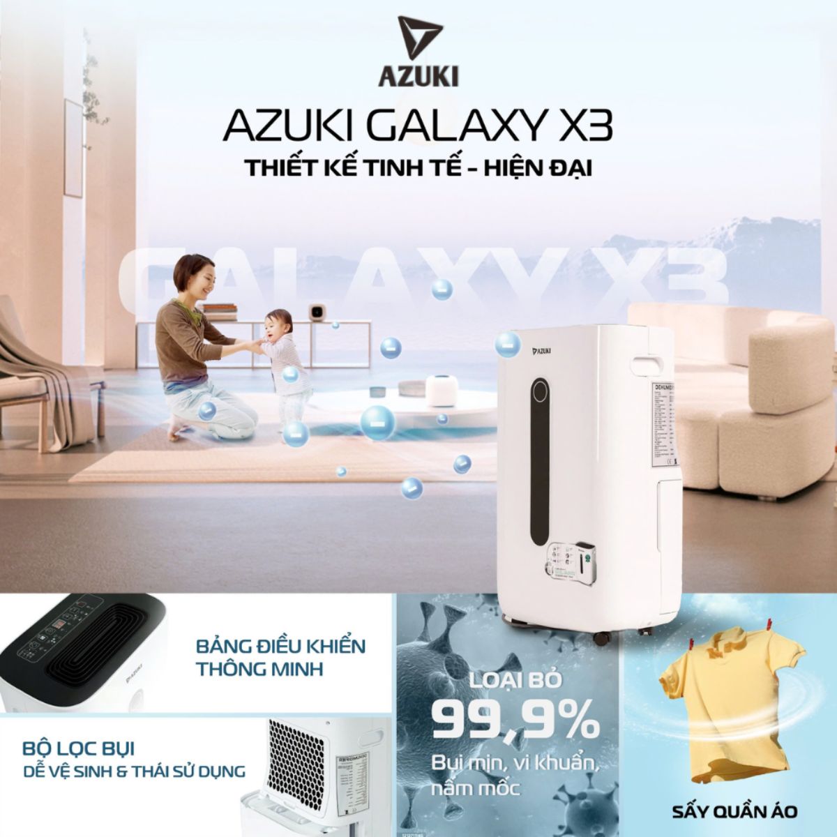 Máy hút ẩm và lọc không khí Azuki Galaxy X3 được thiết kế nhằm đáp ứng nhu cầu kiểm soát độ ẩm và cải thiện chất lượng không khí trong điều kiện khí hậu nóng ẩm, nồm ẩm kéo dài. Với khả năng hút ẩm lên đến 25 lít/ngày, kết hợp lưu thông và lọc không khí, sản phẩm phù hợp sử dụng cho gia đình, căn hộ chung cư, phòng ngủ, phòng làm việc hoặc không gian sinh hoạt kín.